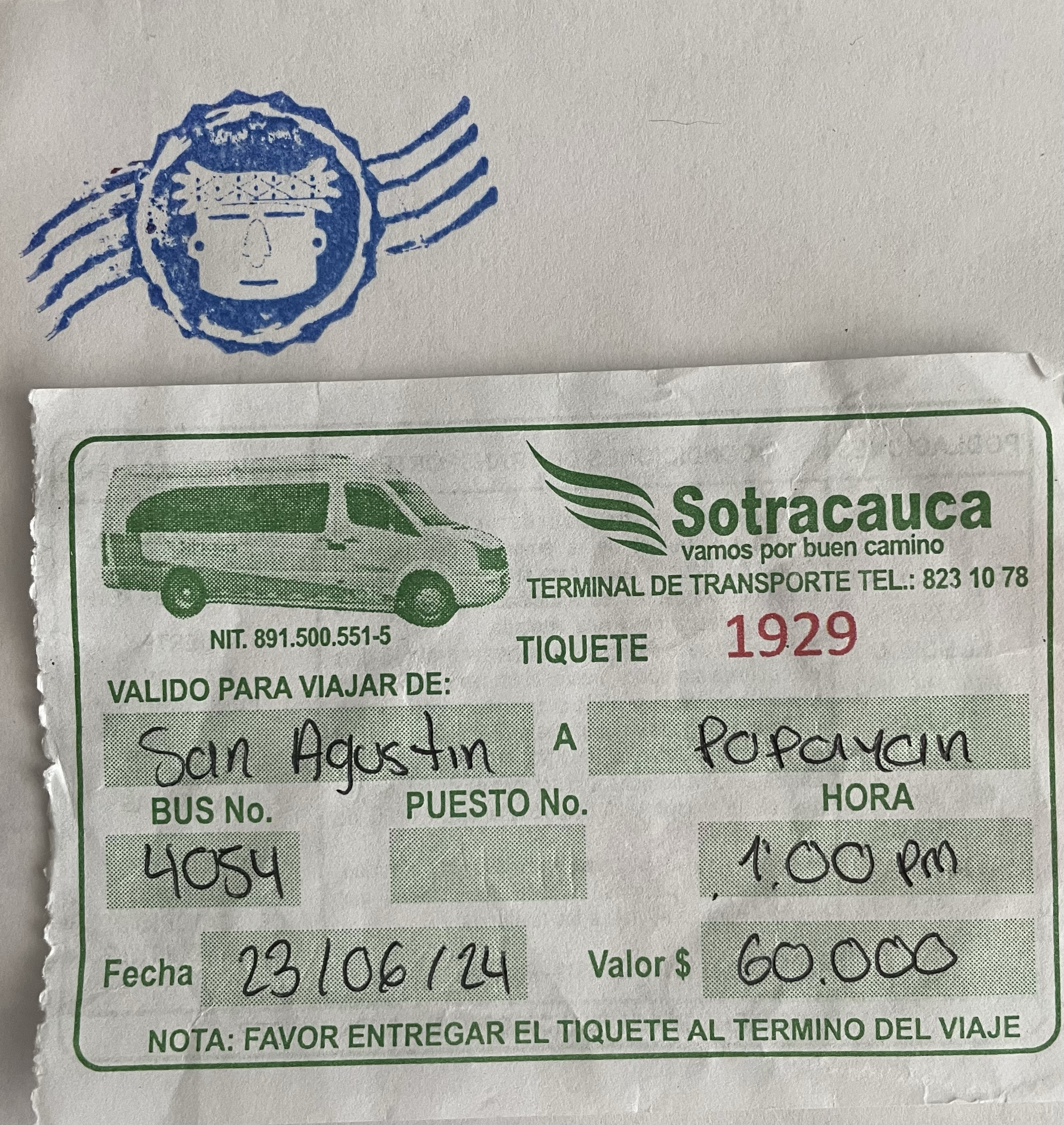 老板直接联系,司机来接。不用走 40 分钟到车站了哈哈哈哈哈。 Van 车接我之后,在路上接几个带行李的阿姨和两个荷兰来的游客。到了小镇车站 Terminal De Transporte De San Agustin,等了 20 分钟。售票员小姐姐中途上车,到了车站又下车坐摩托车走了。 总之就是折腾了很久才出发。等以你为真的要开始正式出发,去目的地的时候,哥伦比亚会教你什么是松弛感。在路上不知道什么村和农场的地方接人,也在别的小镇的车站停下揽客。放人接人,来来回回。